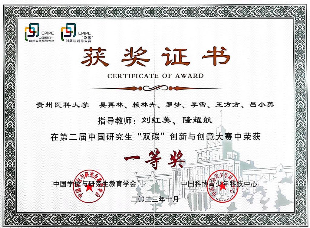 10月28日至29日,第二届中国研究生“双碳”创新与创意大赛决赛在哈尔滨举行。 万象城官网生物与工程学院(健康医药现代产业学院)院长刘红美教授、隆耀航副教授指导学生吴再林、赖林卉、罗梦、李雪、王方方、吕小英完成的“基于循环经济的喀斯特双碳探索与生态产出”项目经过初赛、复赛的层层角逐,成为全国唯一一个医科类院校在该项赛事上入围决赛的项目,并最终荣获全国一等奖。指导教师刘红美、隆耀航荣获“优秀指导教师”。