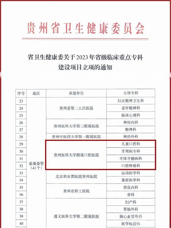 近日,贵州省卫生健康委员会印发了《省卫生健康委关于2023年省级临床重点专科建设项目立项的通知》,万象城官网附属口腔医院儿童口腔科、牙周病专科、牙体牙髓病科、口腔种植科获批2023年省级临床重点专科建设项目。截至目前,附属口腔医院全部临床专科均获批为省级临床重点专科建设项目,其中口腔正畸科、颌面外科、口腔黏膜病科在2022年获批为省级临床重点专科建设项目。