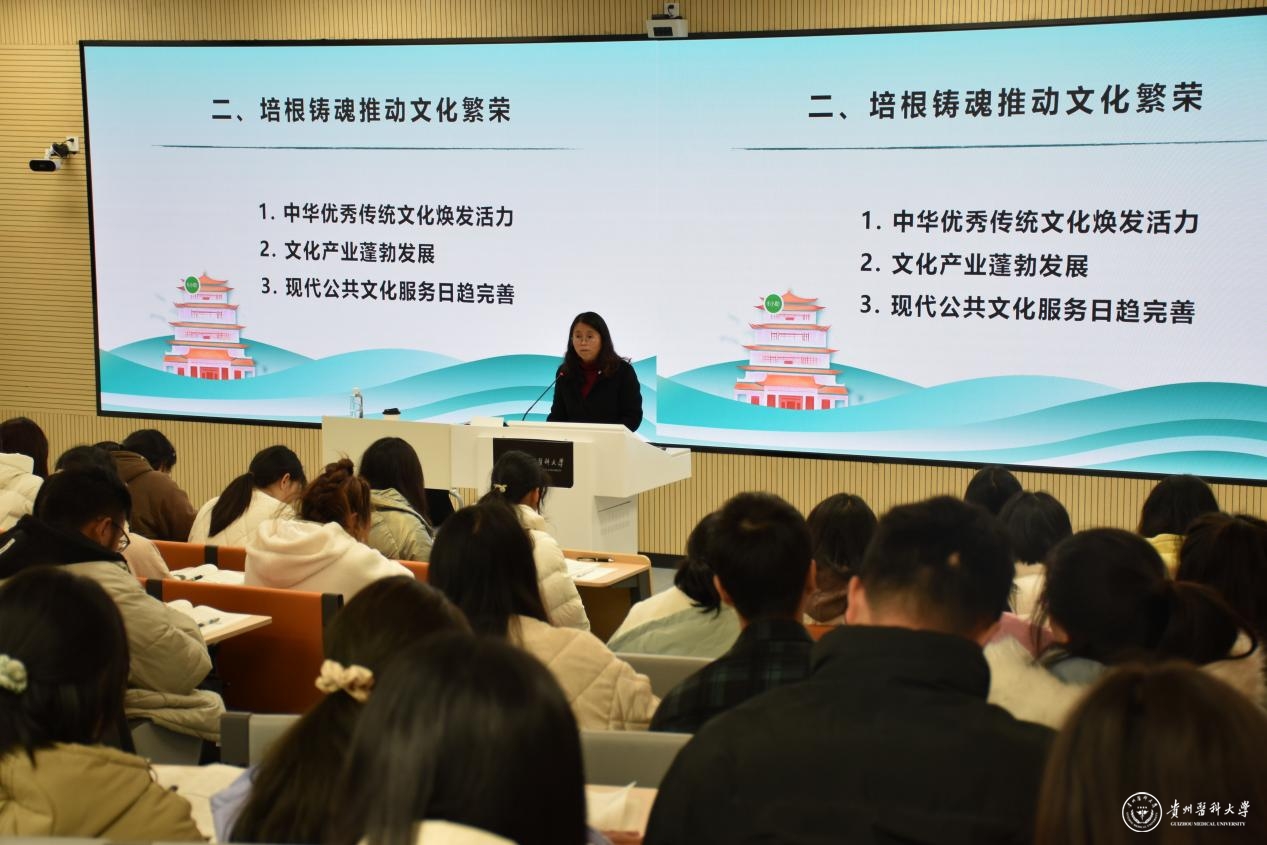最后,蒋红梅对同学们提出希望:要坚定文化自信,传承中华优秀传统文化,弘扬革命文化,发展社会主义先进文化;要秉持开放包容,既坚持马克思主义中国化时代化,传承发展中华优秀传统文化,又要促进外来文化本土化,吸收外来文化精华;要坚持守正创新,努力建设中华民族现代文明,不断铸就中华文化新辉煌、谱写民族复兴新华章。