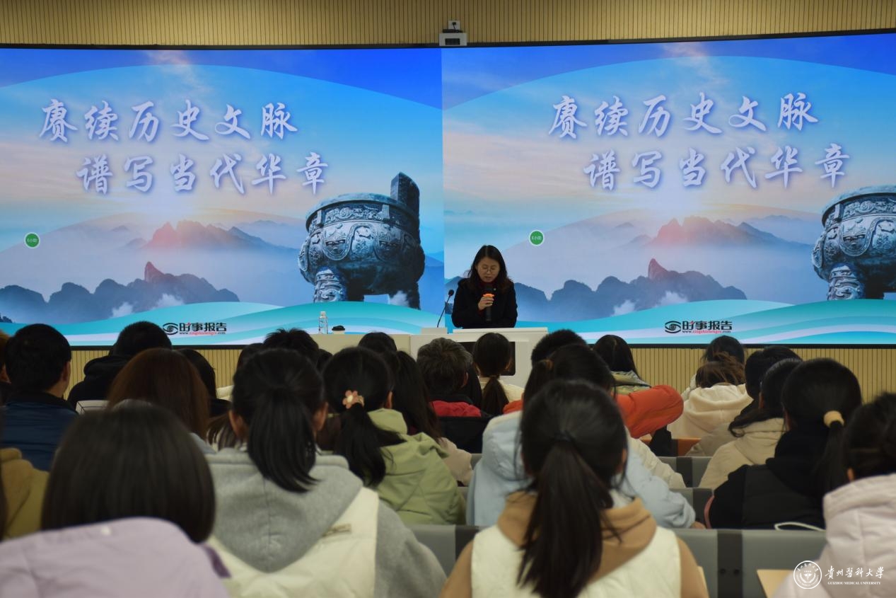11月15日,副校长蒋红梅以“赓续历史文脉,谱写当代华章”为主题,通过现场教学及云端课堂直播相结合的方式,为2023级儿科学、医学检验技术、基础医学、医学实验技术、助产学、麻醉学、口腔医学等7个专业9个班级共710名学生讲授形势与政策课。