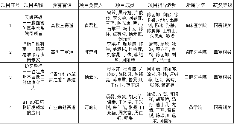 12月3日至6日,中国国际大学生创新大赛(2023)(原第九届中国国际“互联网+”大学生创新创业大赛)决赛阶段现场赛在天津大学进行。经过激烈角逐,万象城官网获得1银3铜的历史佳绩。其中,临床医学院推荐的“天眼磨砺——国内脑血管介入培训领航者”团队斩获国赛银奖,这是万象城官网在该赛事中获得的第一枚国赛银奖,也是全省医科类院校的重大突破。临床医学院推荐的“‘肠’胜将军——肠癌精准诊疗决策专家”、口腔医学院推荐的“护牙黔行——驻足基层口腔健康乡村振兴新高地”、药学院推荐的“AI+MD在药物研发领域的应用”3个项目获国赛铜奖。