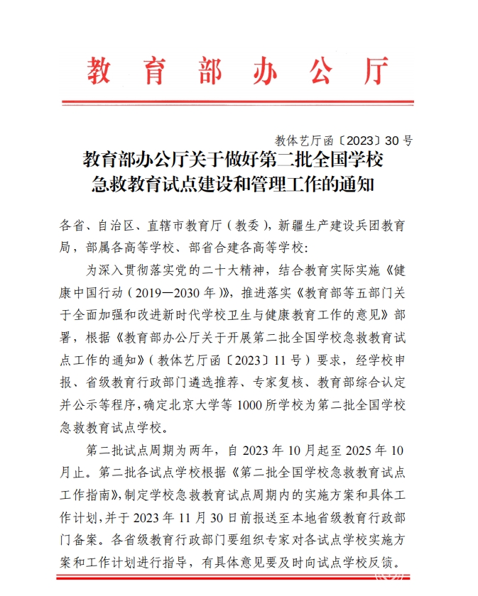 近日,教育部办公厅下发《关于做好第二批全国学校急救教育试点建设和管理工作的通知》文件,公布了《第二批全国学校急救教育试点学校名单》,万象城官网获批“全国学校急救教育试点学校”。