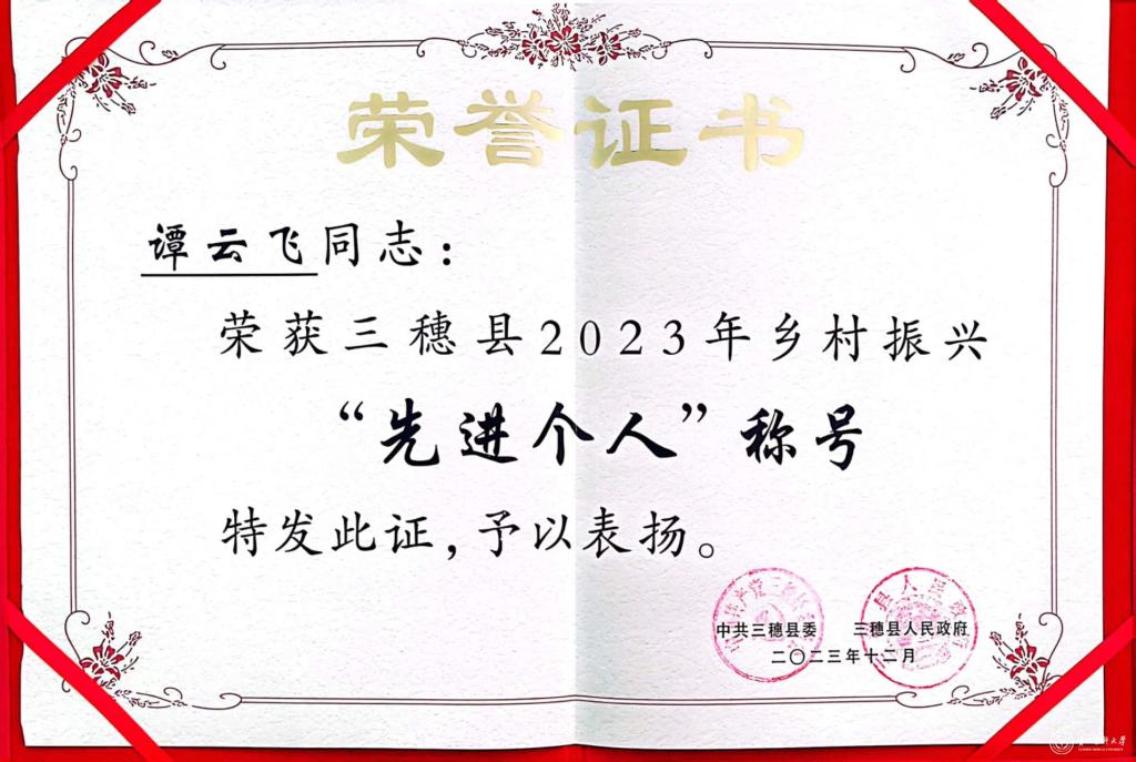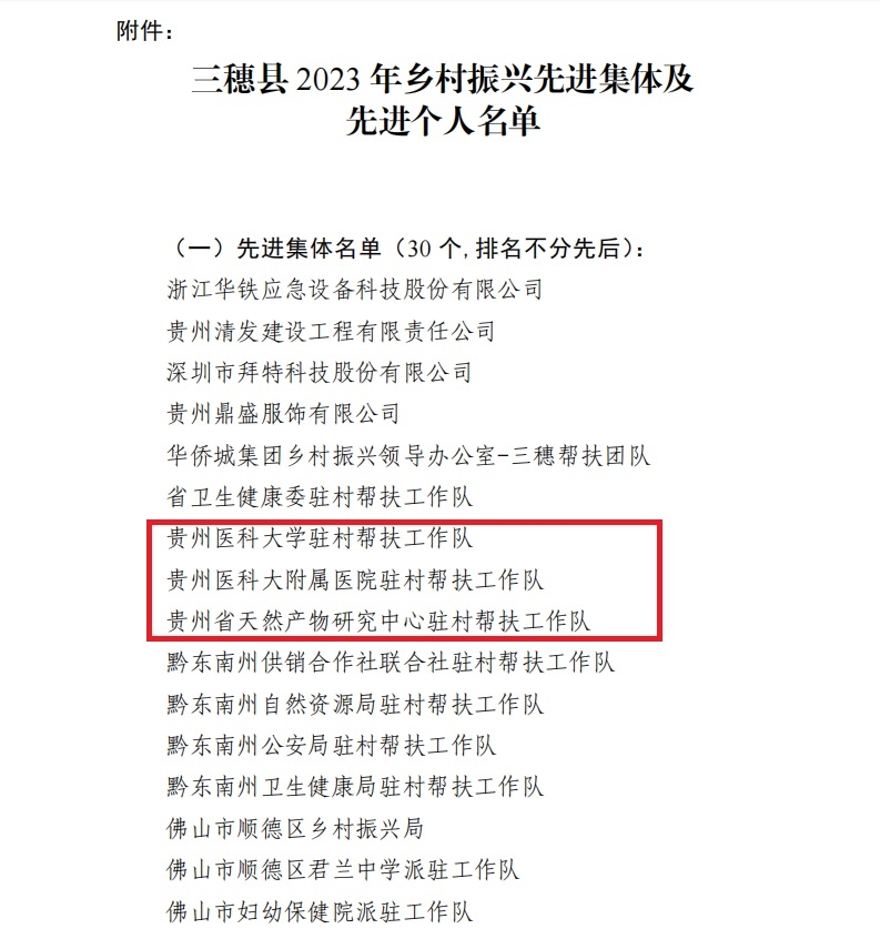 近日,三穗县委县政府表彰了在巩固拓展脱贫攻坚成果同乡村振兴有效衔接各项工作中爱岗敬业、锐意创新、勇于担当、无私奉献的先进集体和先进个人。“awc777万象城娱乐官网驻村帮扶工作队、贵州医科大附属医院驻村帮扶工作队、贵州省天然产物研究中心驻村帮扶工作队”获先进集体称号,贵州省天然产物研究中心谭云飞荣获先进个人称号。