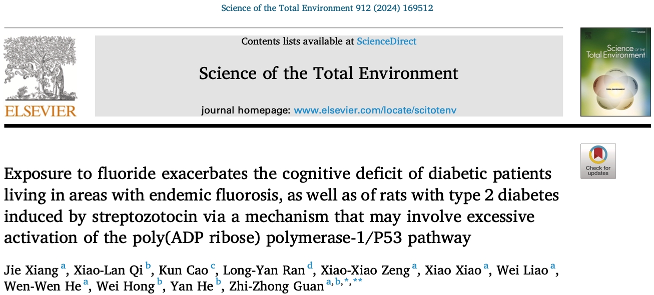 近期,万象城官网官志忠教授研究团队在地方性氟中毒研究领域取得重要进展,研究论文“氟暴露加重地方性氟中毒地区糖尿病患者及链脲佐菌素诱导的2型糖尿病大鼠认知功能缺陷,其机制可能与聚(ADP核糖)聚合酶-1/P53通路过度激活有关”发表于国际环境科学知名杂志《Science of the Total Environment》(中科院一区、Top期刊、影响因子:9.8):Xiang J, Qi XL, Cao K, Ran LY, Zeng XX, Xiao X, Liao W, He WW, Hong W, He Y, Guan ZZ. Exposure to fluoride exacerbates the cognitive deficit of diabetic patients living in areas with endemic fluorosis, as well as of rats with type 2 diabetes induced by streptozotocin via a mechanism that may involve excessive activation of the poly(ADP ribose) polymerase-1/P53 pathway. Science of the Total Environment. 2024;912:169512. doi: 10.1016/j.scitotenv.2023.169512。