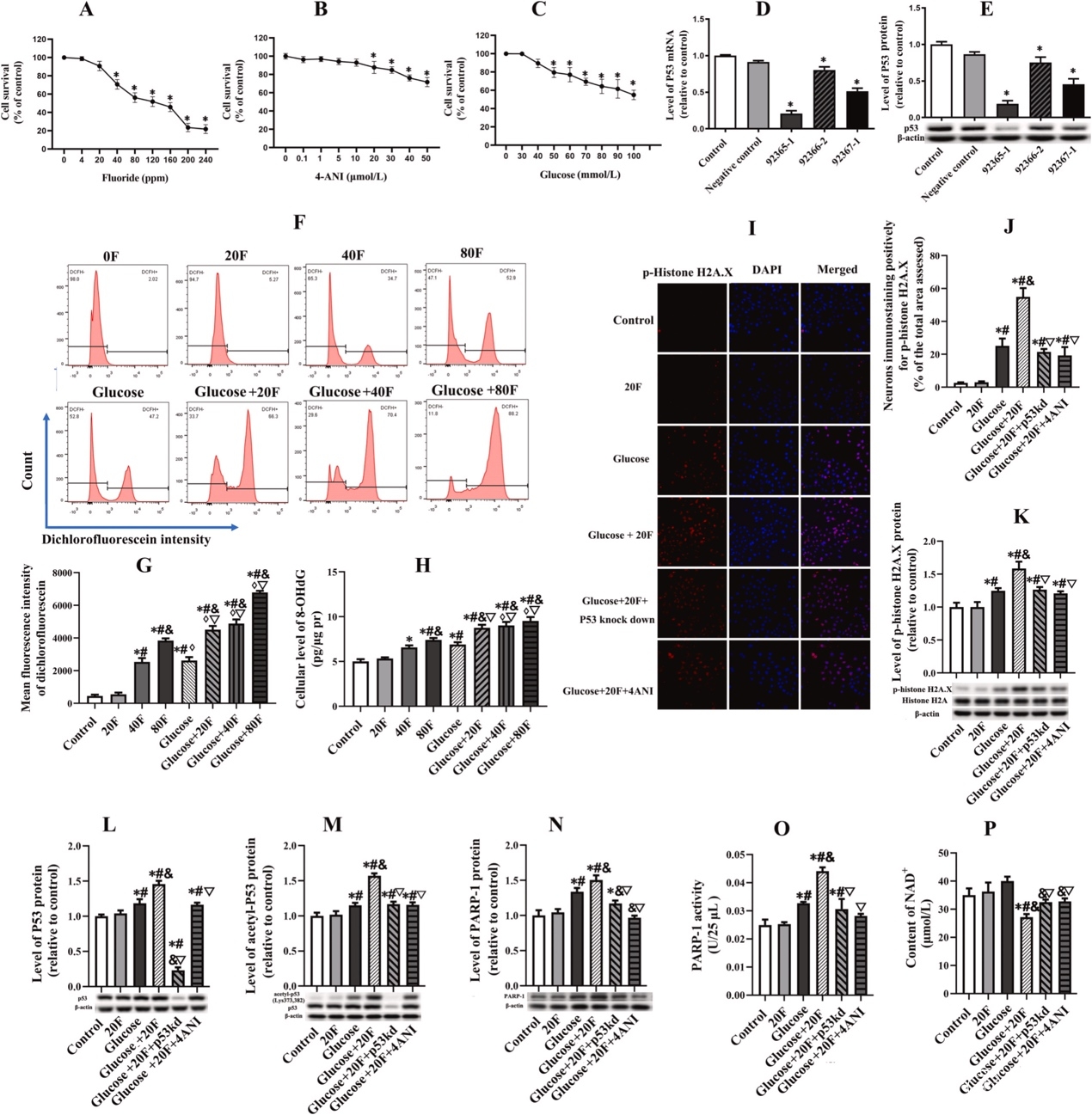 从现象观察到探索机制—通过细胞活力实验筛选对神经元细胞无明显毒性作用的低剂量氟化物,然后通过在不同条件下培养神经元细胞,发现在高糖孵育情况下,神经元对氟化物的毒性耐受力明显降低。通过ROS流式探针检测、免疫荧光及蛋白印迹发现,低剂量氟化物能明显促进高糖培养下神经元的氧化应激损伤伴随DNA双链断裂及PARP-1/P53通路活性过度激活。通过PARP-1抑制剂及P53敲低稳转株构建的反向验证,发现PARP-1/P53通路过度激活的抑制,能逆转上述神经元损伤水平,这可能与NAD+水平的回复有关。