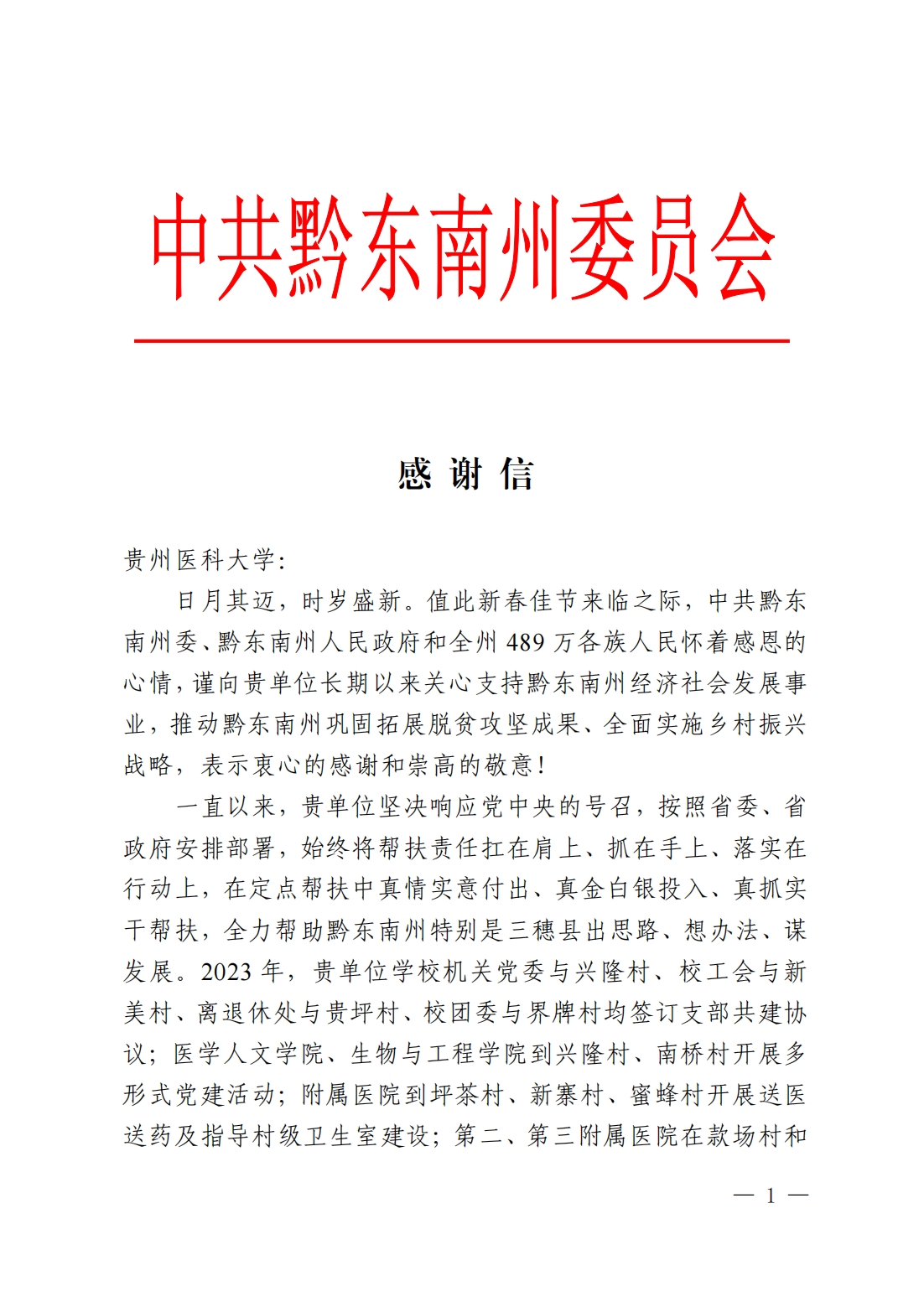 近日,学校收到中共黔东南州委、黔东南州人民政府的感谢信。信中对学校长期以来支持黔东南州,特别是三穗县在巩固拓展脱贫攻坚成果、推进乡村振兴工作中的真情帮扶、鼎力相助表示衷心感谢,高度赞扬学校选派的驻村干部为三穗县乡村振兴工作作出的重要贡献并致以崇高敬意。