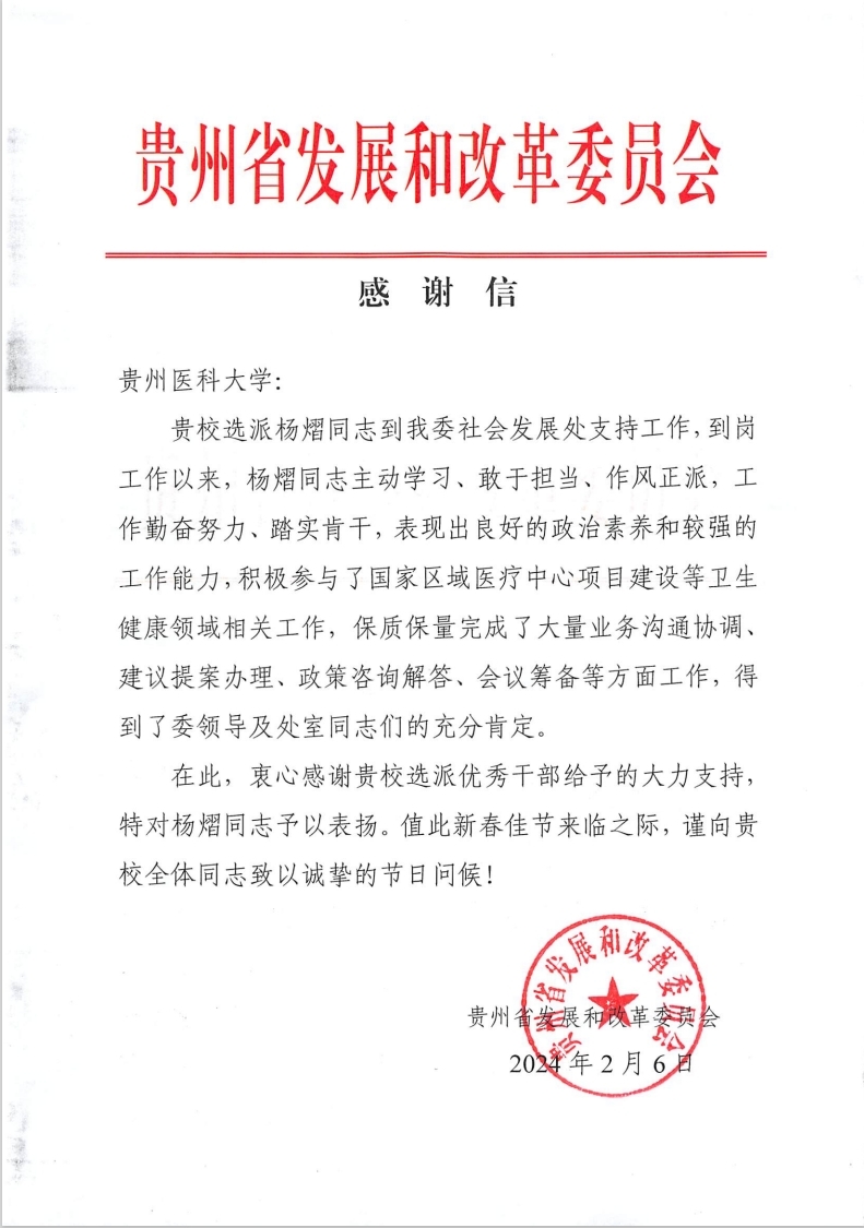 近日,万象城官网收到省发展和改革委员会发来的感谢信,信中对万象城官网选派到省发展和改革委员会社会发展处的杨熠同志给予了高度赞赏和表扬,对学校的大力支持表示衷心感谢。