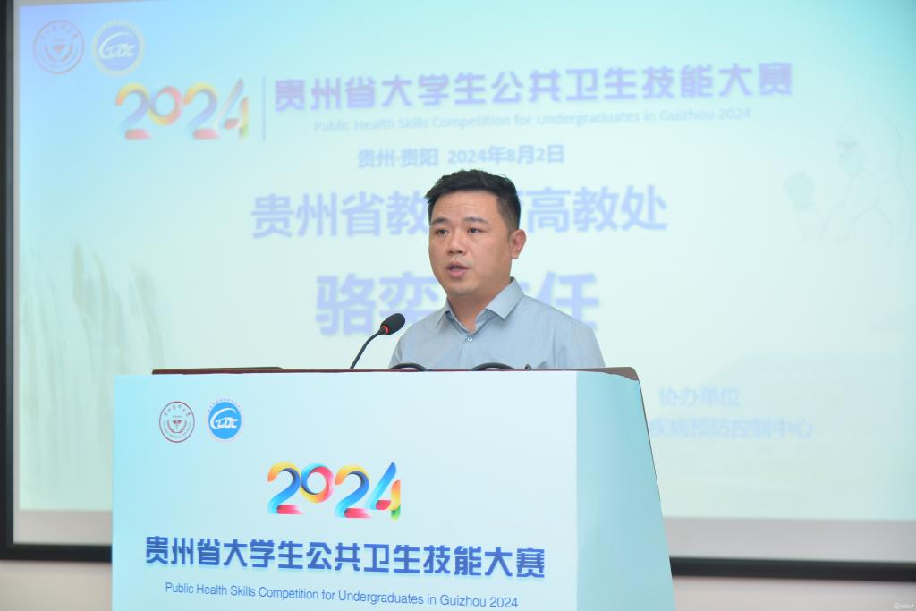 骆奕代表贵州省教育厅向大赛的成功举办表示祝贺,向长期以来关心支持贵州公共卫生教育事业发展的各位领导、专家评委和社会各界人士表示感谢,并希望参赛的同学们在未来的学习和工作中发光发热,为构建和谐健康的社会贡献自己的一份力量。