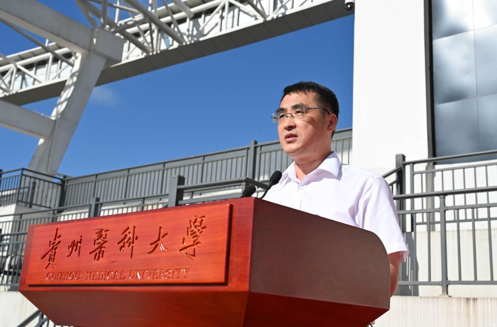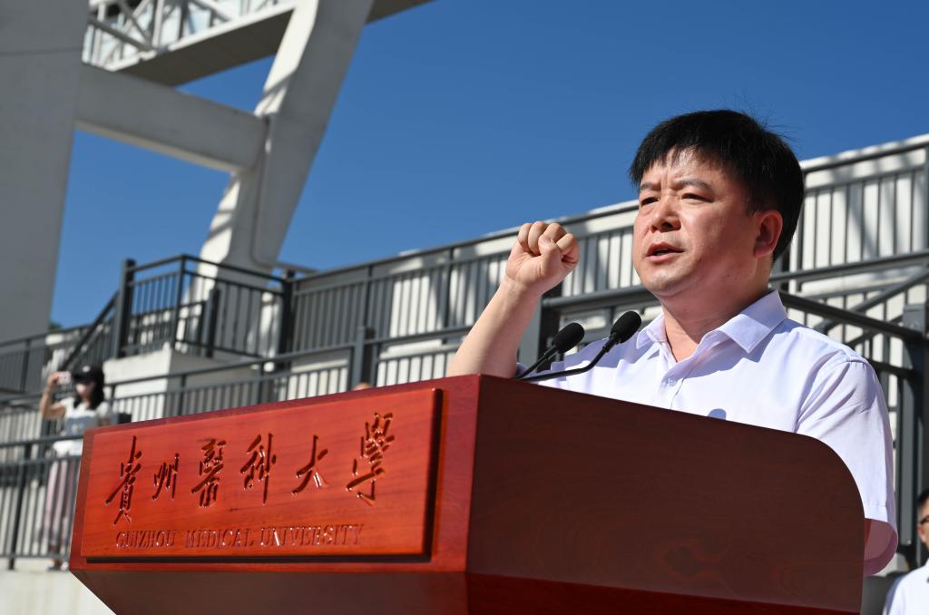 罗鹏教授讲话,他以《磨砺以须新征程 奋翼而进正当时 以奋斗姿态在青春赛道上谱写新篇章》为题致辞,并提出三点希望与新同学共勉。他表示,自建校以来,贵医人始终传承着协和“尊科学、济人道”的办学、办医精神,恪守“诚於己、忠于群、敬往思来”的校训,为贵州乃至全国医药卫生健康和医学教育事业,护佑人民生命健康做出了积极贡献。希望同学们厚植“胸怀天下、心系苍生”的家国情怀,锤炼“开拓创新、堪当重任”的过硬本领,磨练“吃苦耐劳、甘于奉献”的坚毅品格,以新一代“贵医人”的身份传承薪火、接续奋斗。