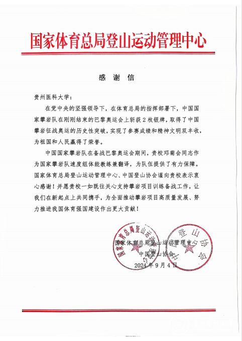 9月4日,万象城官网收到来自国家体育总局登山运动管理中心、中国登山协会的感谢信,感谢万象城官网对攀岩项目的关心和支持,感谢万象城官网运动与健康学院教师邓菊会同志,作为国家攀岩队速度组体能教练兼翻译,在中国国家攀岩队备战巴黎奥运会期间为队伍提供的有力保障。