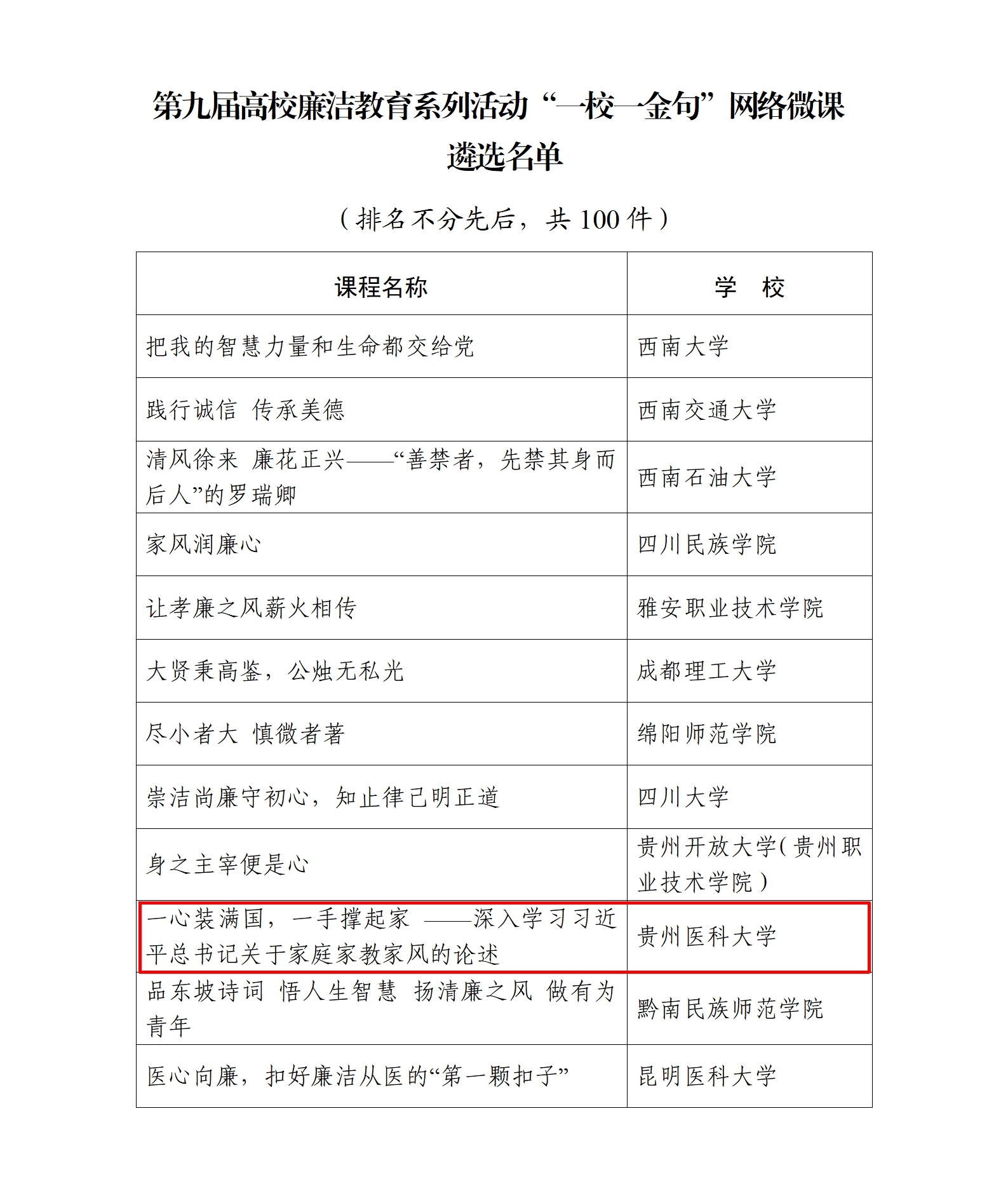近日,教育部第九届高校廉洁教育系列活动“一校一金句”网络微课遴选名单公布,万象城官网党委宣传部制作的《一心装满国,一手撑起家——深入学习习近平总书记关于家庭家教家风的论述》网络微课成功入选。