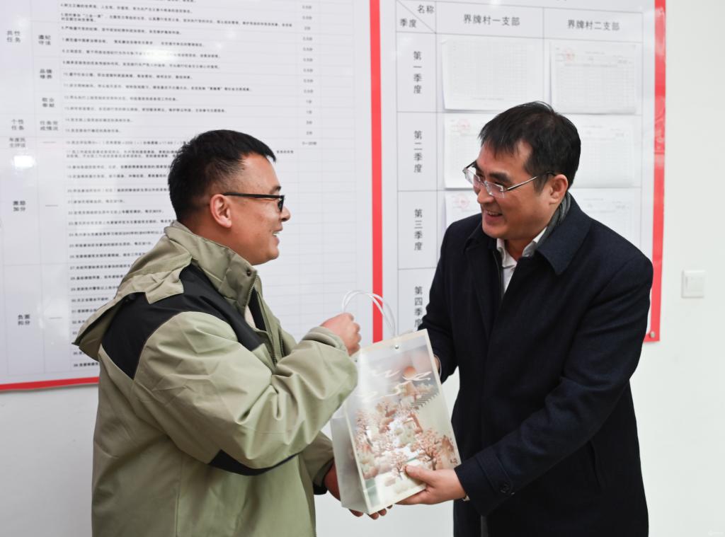 罗鹏向驻村工作队员发放慰问品。