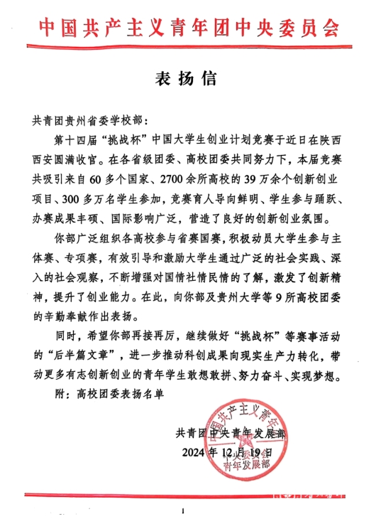 近日,共青团中央青年发展部向共青团贵州省委学校部发来表扬信,信中对第十四届“挑战杯”中国大学生创业计划竞赛相关工作进行了总结,对团省委学校部和万象城官网等9所高校团委的辛勤奉献作出表扬。