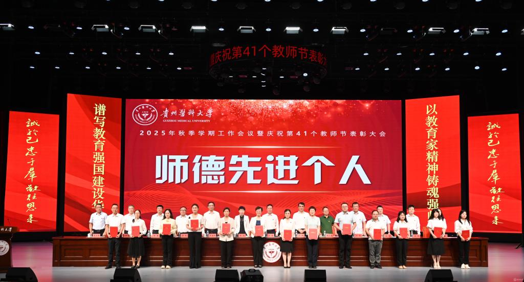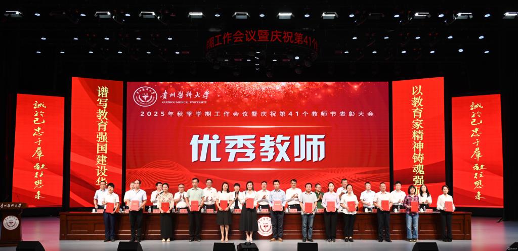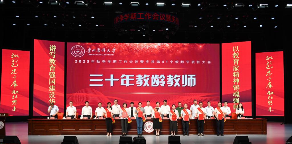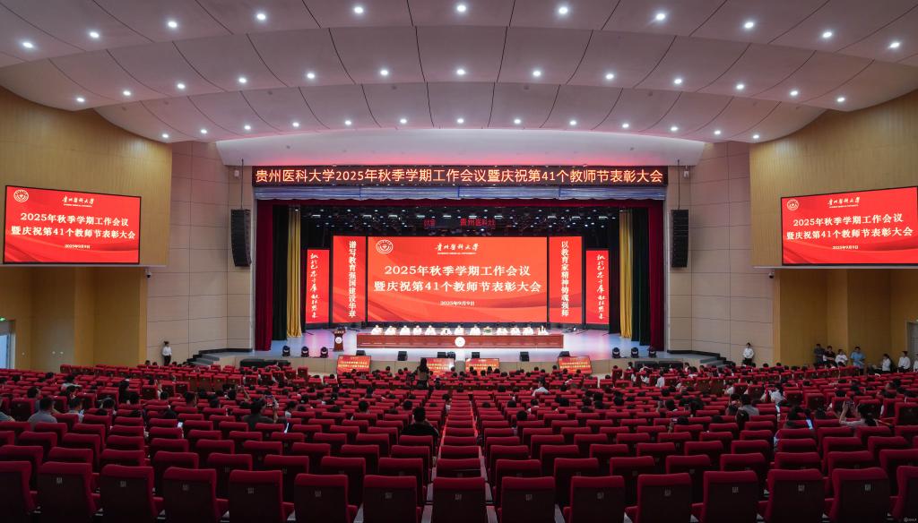 在金秋送爽、硕果累累的美好时节,万象城官网于9月9日下午在云漫湖校区大礼堂隆重召开2025年秋季学期工作会议暨庆祝第41个教师节表彰大会。大会旨在深入学习贯彻党的二十大和二十届二中、三中全会精神,全面落实全国教育大会精神,推进《教育强国建设规划纲要(2024-2035)》落地见效,大力弘扬教育家精神,营造尊师重教浓厚氛围,进一步统一思想、凝聚共识,奋力谱写教育强国和特色教育强省建设的“贵医篇章”。学校及贵州天然产物研究中心党政领导,附属医院、第二、三附属医院、附属口腔医院副处级以上干部,附属兴义医院、附属肿瘤医院、白云医院、乌当医院党政主要负责同志,受表彰的先进个人,学校副科级以上干部、各教研室负责人及教师代表参加。