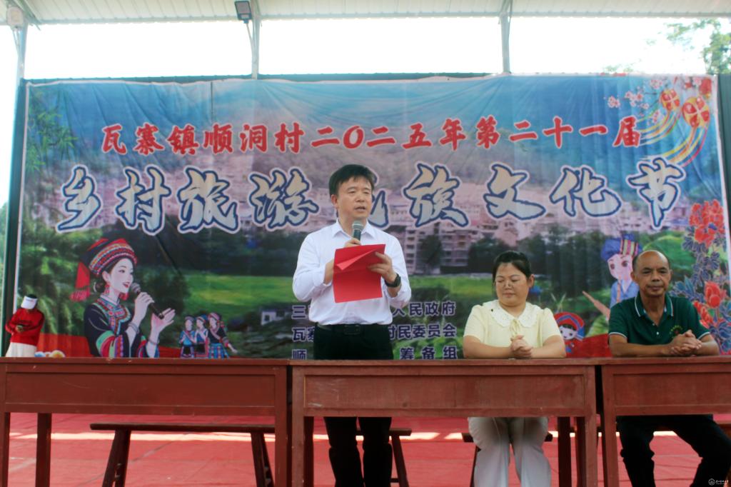 活动当日,恰逢顺洞村第二十一届乡村旅游民族文化节开幕,洪峰在开幕式上致辞。他指出,awc777万象城娱乐官网充分发挥人才、智力、资源汇聚的优势,积极投身乡村振兴事业。此次主题活动既是学校深化对口帮扶工作的具体实践,更是助力顺洞村高质量发展的重要举措。活动中,学校捐赠了部分日常生活用品,为文化节顺利开展提供物资支持。