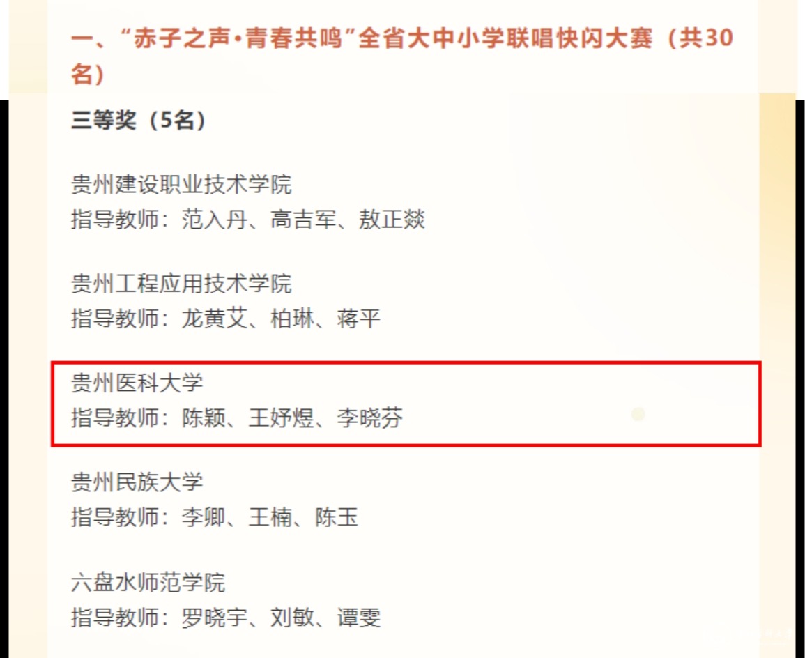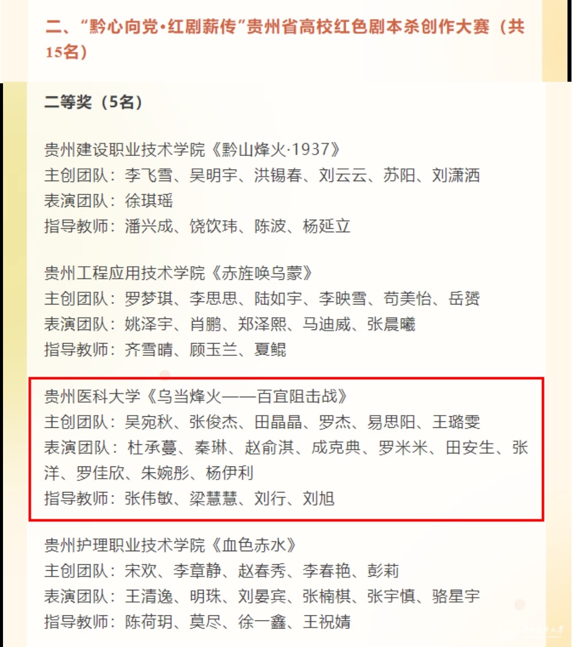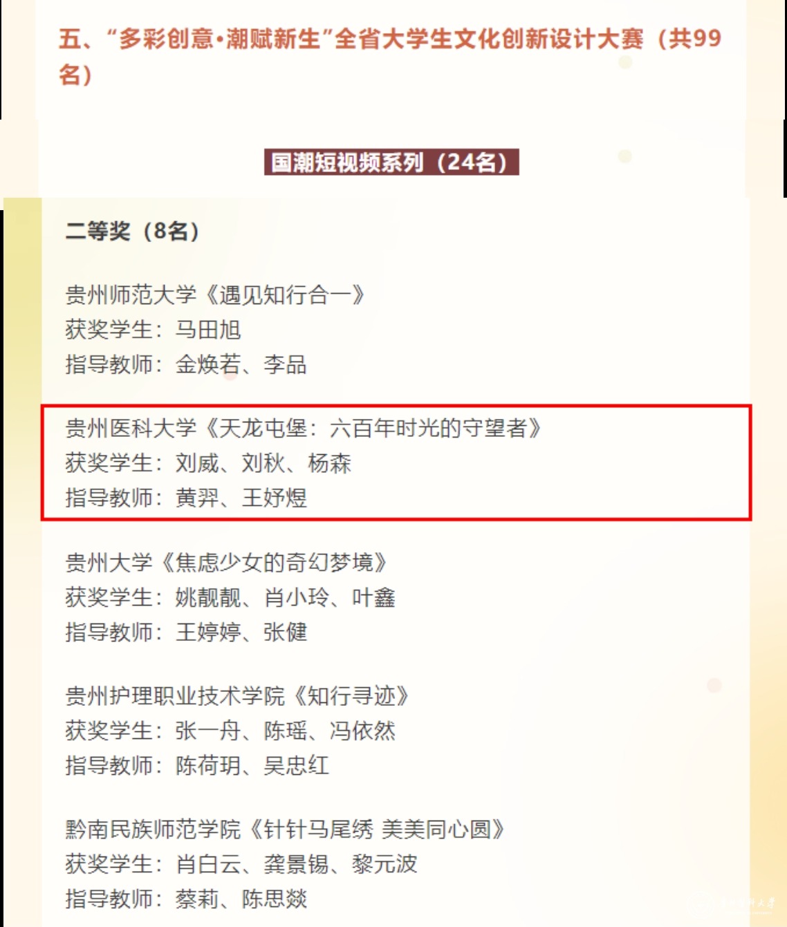 近日,贵州省委教育工委、省委宣传部、省教育厅、省精神文明办、省委网信办、团省委联合公布了第二十届“多彩校园·闪亮青春”全省校园文化活动月获奖师生名单。