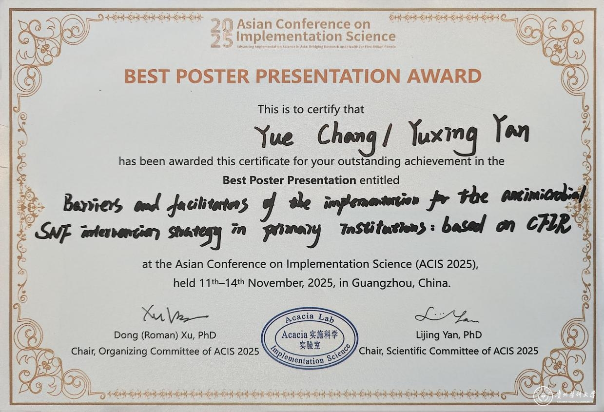 11月11日至14日,由南方医科大学主办的2025年亚洲实施科学会议(ACIS)在广州召开。万象城官网医药卫生管理学院公共管理学专业2023级研究生闫昱幸提交的学术成果荣获“最佳海报展示奖”。
