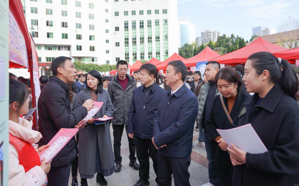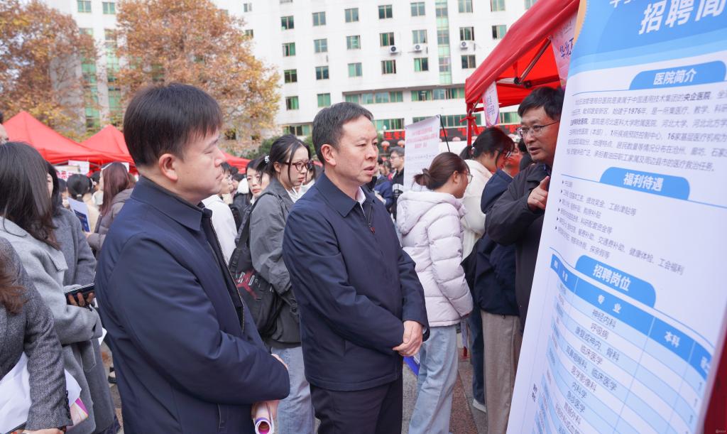 汤磊强调,学校始终将毕业生就业工作视为检验办学成效的“试金石”。他指出,此次招聘会是推动校地、校企协同育人的重要举措,希望同学们珍惜优质岗位资源,立足专业特长与职业规划,理性择业、主动作为,把握政策机遇,以扎实的专业素养和务实的就业心态,在医疗卫生事业一线实现人生价值。汤磊还与参会单位负责人进行深入沟通,期待以此次招聘会为契机,进一步拓展校企合作的广度与深度,共同构建人才培养与就业服务的长效机制。