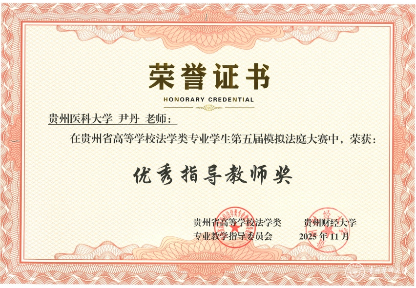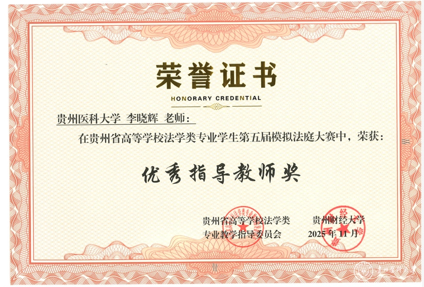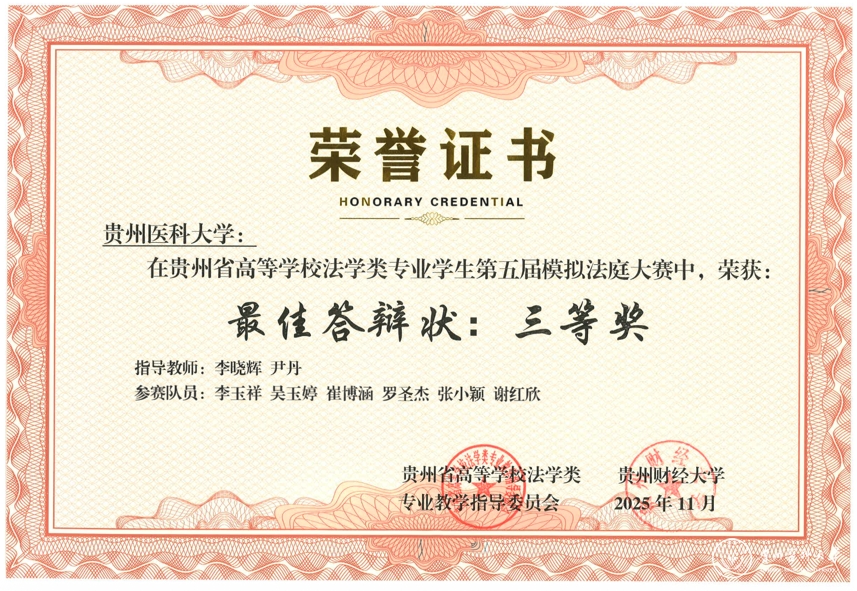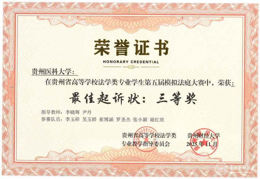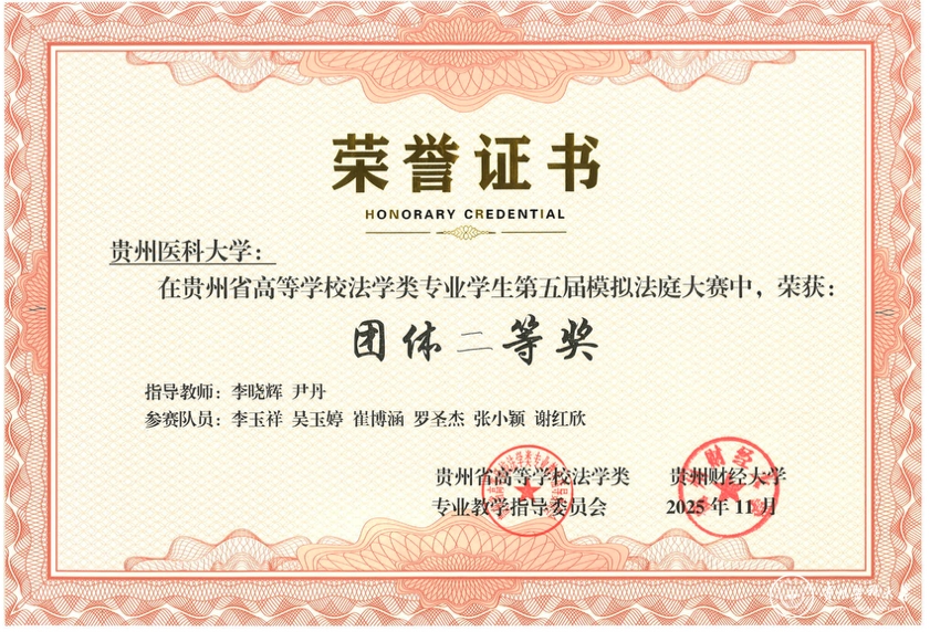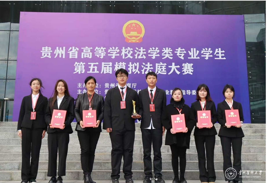 11月22日,贵州省高等学校法学类专业学生第五届模拟法庭大赛在贵州财经大学落幕。万象城官网医学人文学院李晓辉、尹丹两位老师带队指导,李玉祥、吴玉婷、崔博涵、罗圣杰、张小颖、谢红欣6名本科生组成的参赛团队,以总排名第三的优异表现蝉联“团体二等奖”,同时斩获“最佳起诉状三等奖”“最佳答辩状三等奖”两项单项荣誉,李晓辉、尹丹获评“优秀指导教师奖”。