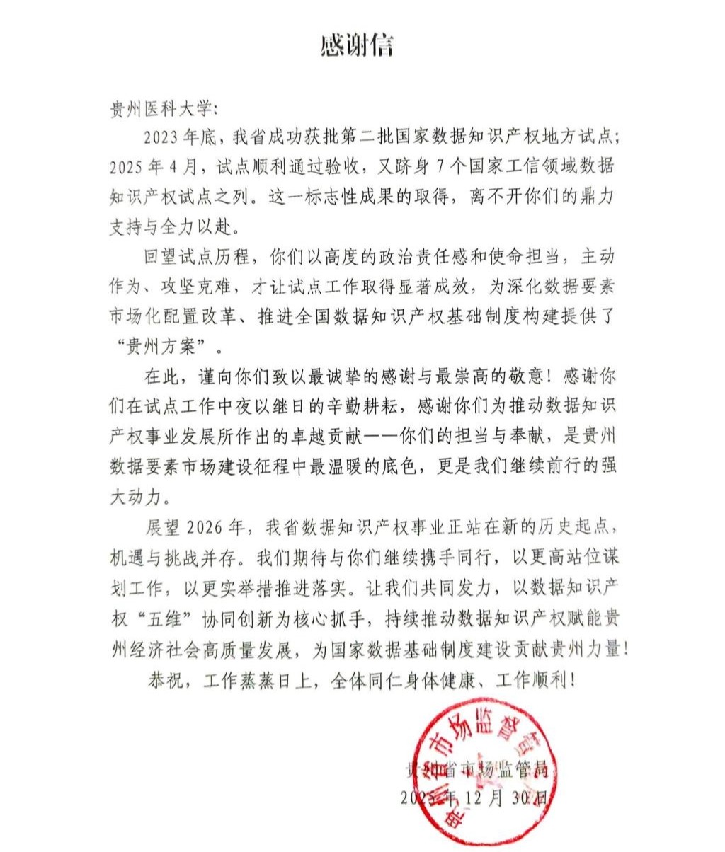 据悉,贵州省2023年底获批第二批国家数据知识产权地方试点,2025年4月通过验收后,又跻身7个国家工信领域数据知识产权试点之列。感谢信指出,这一成果的取得离不开万象城官网的鼎力相助,学校以高度的政治责任感和使命担当,主动作为、攻坚克难,为试点工作成效贡献了贵医力量。