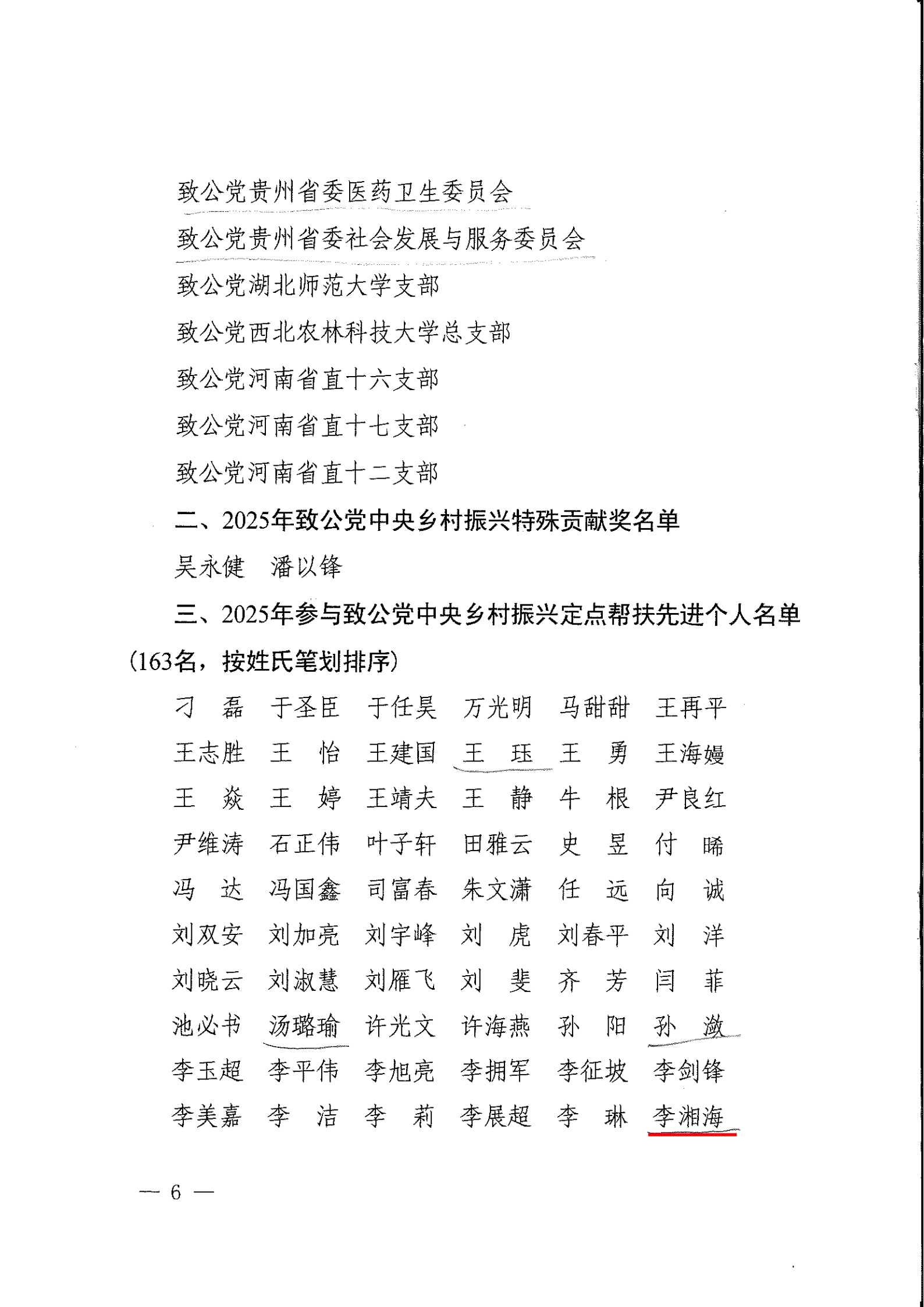 近日,致公党中央对2025年乡村振兴定点帮扶先进集体和先进个人进行表彰。致公党awc777万象城娱乐官网总支部主委、awc777万象城娱乐官网附属医院医务处副处长、医疗质量与安全管理处副处长李湘海,awc777万象城娱乐官网附属医院急诊ICU主任医师罗语思,荣获“2025年参与致公党中央乡村振兴定点帮扶先进个人”荣誉称号。