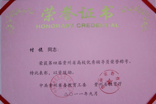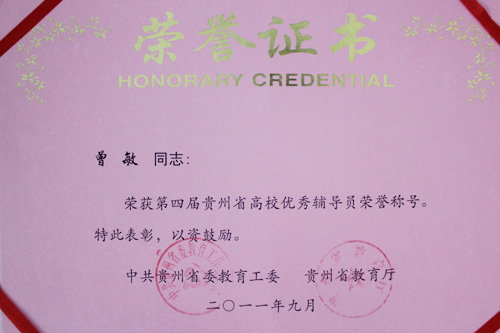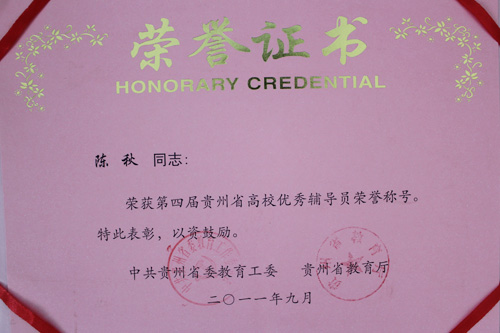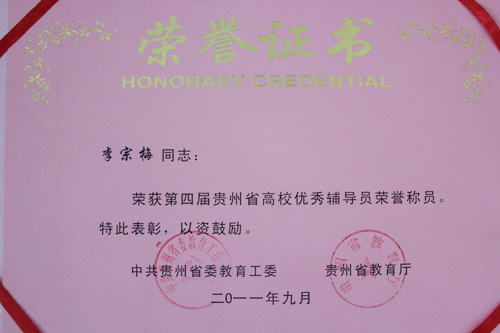 在第四届贵州省高校优秀辅导员评比活动中,万象城官网辅导员李宗梅、曾敏、陈秋、付旎四位同志荣获贵州省“优秀辅导员”荣誉称号。