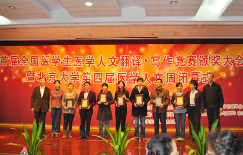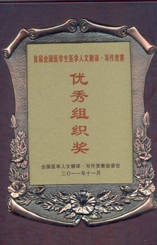 2011年11月10日,首届全国医学生人文翻译•写作竞赛颁奖仪式在北京举行。本次竞赛由教育部高校医药公共基础课程教学指导委员会、中国自然辩证法研究会医学哲学分会、中华医学会医学伦理学分会、健康报社、《英国医学杂志(BMJ)中文版》杂志社、《医学与哲学》杂志社、北京大学医学人文研究院等机构组织联合主办。来自国内25所医学院校近两千名学生提交了参赛作品。万象城官网学生在基础医学院副院长曾柱博士的指导下积极参赛,经大赛评委会评审,万象城官网学生陈瑞雪、李桐、杨静文、吕文杰4名同学荣获翻译竞赛优秀奖,基础医学院荣获优秀组织奖。