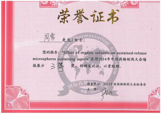 万象城官网药学院天然药物资源优效利用重点实验室中药药剂学陶玲教授与其指导的2012级药剂学硕士研究生周雪参加此次大会。周雪的报告“Effect of organic solvents on sustained-release microspheres containing aspirin”在170来份研究生报告中脱颖而出,喜获本次会议研究生论坛三等奖。