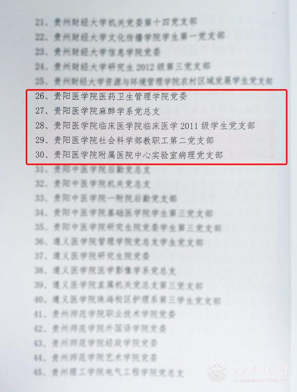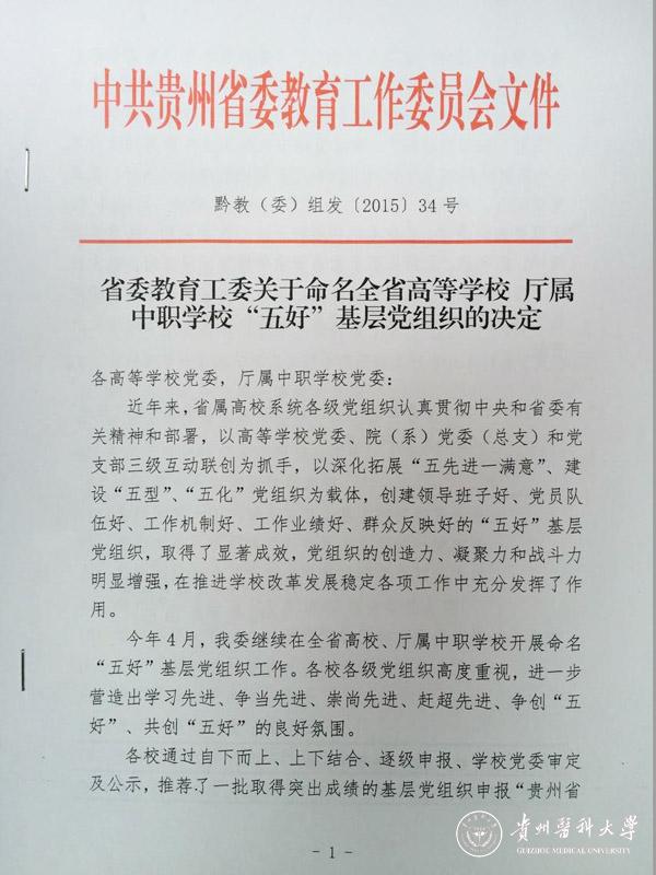 近日,省委教育工委下发了《关于命名全省高等学校厅属中职学校“五好”基层党组织的决定》(黔教(委)组发〔2015〕34号),命名表彰了一批全省高校“五好”基层党组织。万象城官网医药卫生管理学院党委、麻醉学系党总支、临床医学院临床医学2011级学生党支部、社会科学部教职工第二党支部、附属医院中心实验室病理党支部等5个基层党组织荣获全省高校“五好”基层党组织称号。