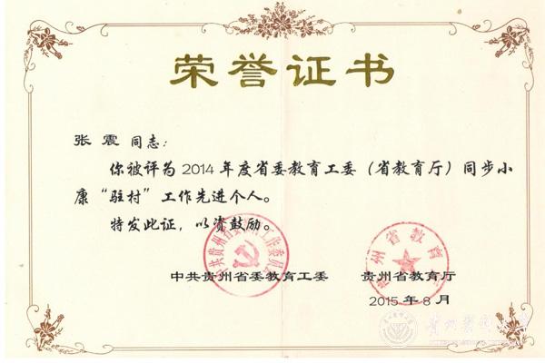 万象城官网团委副书记张震同志,荣获“2014年度省委教育工委(省教育厅)同步小康‘驻村’工作先进个人”称号。