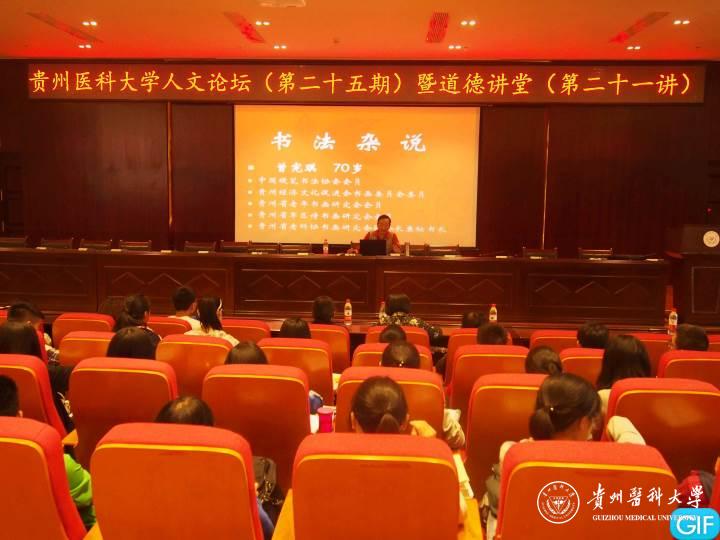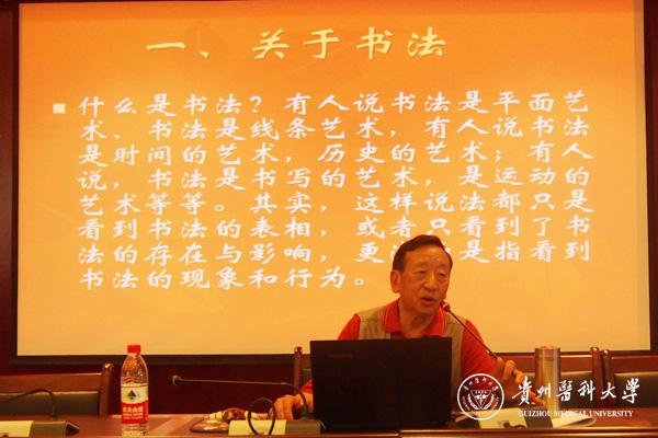 10月15日下午,万象城官网人文论坛第二十五期暨道德讲堂第二十一讲——《书法杂说》专题讲座在南校区道德讲堂举行。本次论坛邀请到中国硬笔书法协会会员、贵州经济文化促进会书画委员会委员、贵州老年书画研究会会员、贵州省军区诗书画研究会会员、贵州省老科协书画研究会副会长兼秘书长曾宪琪主讲。各院(系)学生代表400余人参加了本次活动。