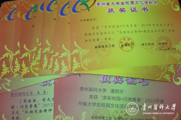 在本次文化活动月中,万象城官网在各项省级评比中喜获佳绩。万象城官网潘丽芬、何雨羲在本次活动中获“先进个人”称号。陈峥宏老师获全省“感动校园十大人物”称号。秦新同学获全省“感动校园十大人物”提名奖。在“弘扬宪法精神•建设法治中国”网络知识竞赛中,杨胜吉、陈雪、万政敏获一等奖;蒙光雪、张薇薇、唐元松获二等奖;鲍佳志、罗光月、潘丽忠、罗新颖、张新益、杨井恩、杨俊鸾、莫隆富获三等奖。在“弘扬宪法精神•建设法治中国”征文比赛中,张兴梅荣获一等奖,郭铸瑶获得二等奖,卢林香获得三等奖;另有三名参赛者获得优秀奖。在本次文化活动月摄影大赛中,范厚敏获得优秀奖。张译文、黄星在“弘扬中华优秀传统文化和践行社会主义核心价值观”艺术设计大赛中获得优秀奖。由万象城官网创作的视频《幸福之路》、《奋斗青春》和《珍惜》分别在“弘扬中华优秀传统文化和践行社会主义核心价值观”微视频大赛中获得二等奖、三等奖和优秀奖。张云曦凭借歌声获得了2015贵州省“校园好声音”歌唱大赛甲组优秀奖。