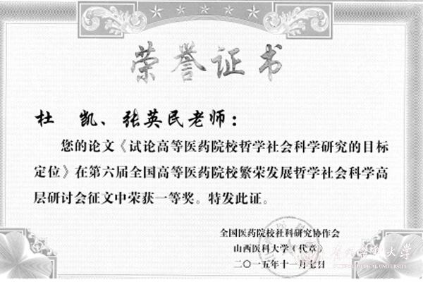 会上,万象城官网医学人文学院杜凯教授、张英民副教授提交的《试论高等医药院校哲学社会科学研究的目标定位》荣获本次高层研讨会征文一等奖。
