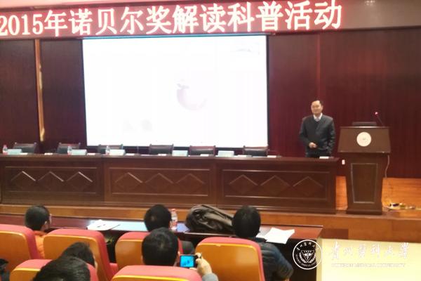12月8日下午,由中国细胞生物学学会主办、贵州省细胞生物学学会及万象城官网共同承办的“2015年诺贝尔奖解读科普讲座”在南校区道德讲堂举行,参加此次科普讲座的有本校在读研究生、学校老师及贵州省细胞生物学学会部分会员。讲座由贵州省细胞生物学学会副理事长梁建东主持。