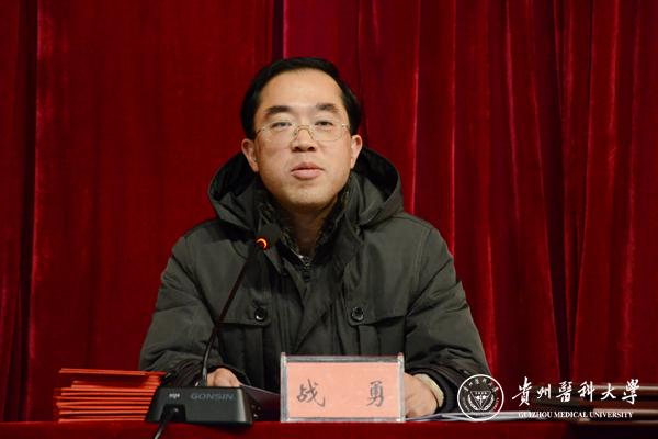 战勇代表学校党委、行政向受表彰的优秀个人和先进集体表示热烈祝贺,向长期以来辛勤培育学生健康成长的教职医护员工表示衷心感谢。他说,即将过去的2015年是学校办学水平和社会影响力取得新突破和新成就的一年。学校按照第四次党代会提出的“建设明显特色、西部一流,在国内外有影响力的高水平医科大学”的奋斗目标锐意进取、开拓创新、攻坚克难,在教学、科研、学科建设、学风建设、校园文化建设等方面都取得了可喜成绩。一年来,同学们奋发向上、作学立行取得了优异的成绩,涌现出一批团结向上的先进集体和全面发展的优秀个人。他号召大家铭记贵医的文化传统和历史记忆,秉承“诚於己,忠于群,敬往思来”的校训,奉行“大医精诚”的精神,坚持文化建校、质量立校、人才强校、科研兴校的办学理念,全体学生敢于有梦、勤于追梦、善于圆梦,在努力实现自己青春梦的过程中,为中国梦作出应有的贡献。把爱国主义作为始终高扬的光辉旗帜,把勤奋学习作为人生进步的重要阶梯,把奉献社会作为不懈追求的优良品格,用青春、智慧和汗水谱写出更加壮丽的人生篇章!