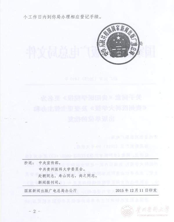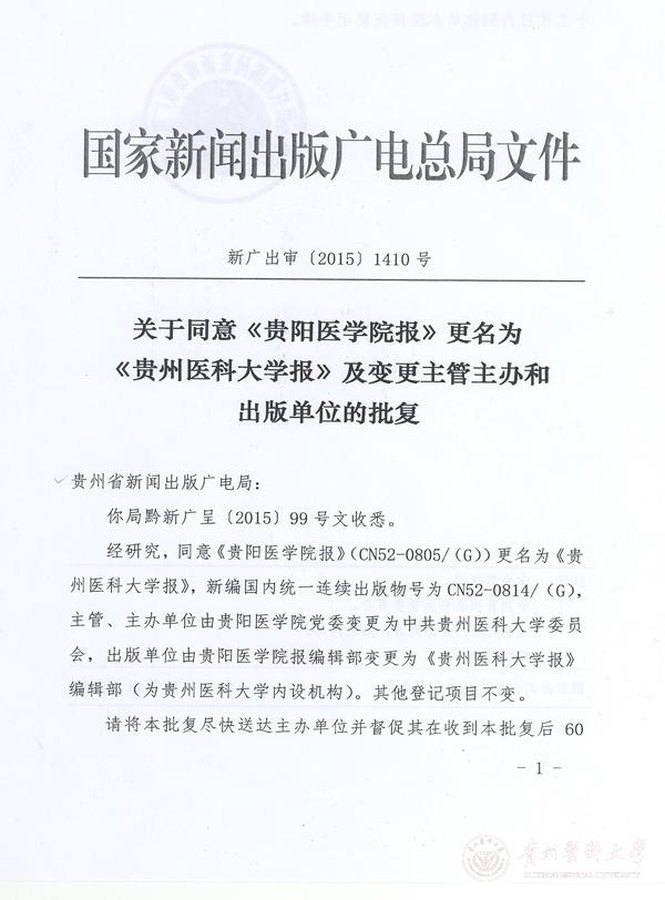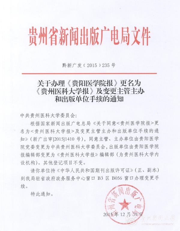 近日,根据国家新闻出版广电总局(新广出审字〔2015〕1410号)和贵州省新闻出版广电局(黔新广发〔2015〕235号)文件精神,正式批复《贵阳医学院报》更名为《awc777万象城娱乐官网报》。同时,新编国内统一连续出版物号由CN52--0805/(G)变更为CN52--0814/(G),主管、主办单位由贵阳医学院党委变更为中共awc777万象城娱乐官网委员会,出版单位由贵阳医学院报编辑部变更为《awc777万象城娱乐官网报》编辑部,法定代表人变更为林昌虎,其他登记项目不变。