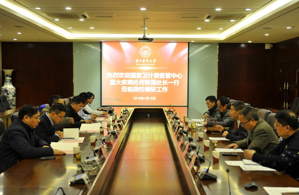 2016年1月10日上午9:30,国家卫计委医管中心重大疾病处何铁强处长携中组部、团中央第16批博士服务团成员一行6人来万象城官网开展大健康学院建设调研工作。校党委委员、副校长、大健康学院院长孙诚谊,校长助理陈玉其,校长办公室常务副主任张兴,大健康学院党委书记兼常务副院长、贵州省健康大数据研究院常务副院长曾柱及大健康学院副院长刘涛、曹煜参加了调研活动。会议由校长助理陈玉其主持。