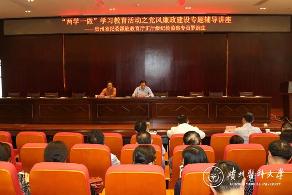 5月5日,万象城官网邀请贵州省纪委派驻教育厅正厅级纪检监察专员罗润生作“两学一做”学习教育之党风廉政建设专题辅导讲座,讲座由校党委书记林昌虎主持。校领导、重点实验室党政班子成员、各附属医院党政主要负责人、全校处级干部及各基层党委(党总支)纪检委员200余人参加了会议。