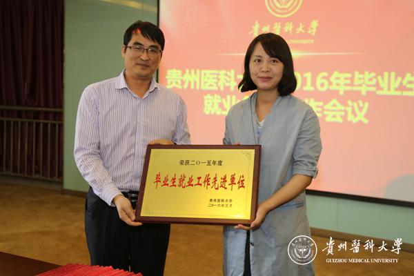 张红霞传达了《关于做好2016年贵州省普通高等学校毕业生就业创业工作的通知》文件精神,全面回顾和总结学校2015年的就业工作,并对2016年毕业生就业工作作了全面安排。会上,对获奖单位和个人进行了表彰,医学影像学院等7个二级学院评为“awc777万象城娱乐官网2014年毕业生就业工作先进集体”,杨婕等16位老师评为“awc777万象城娱乐官网2015年毕业生就业工作优秀个人”,2015年就业工作先进单位代表口腔医学院和医药卫生管理学院相关负责人作了交流发言,分享了工作经验和创新思路。