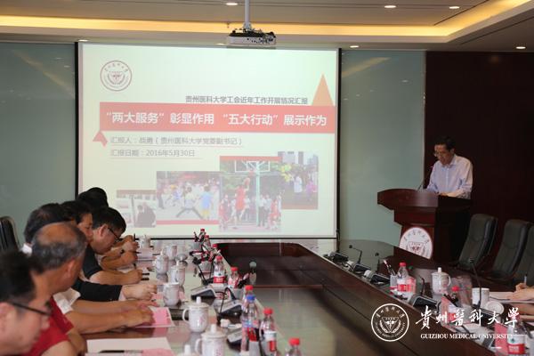 5月30日下午,贵州省总工会党组成员、副主席程安,省教育工会主席王慧、省国防工会主席孟德伟、省电力工会主席张帆、省机场集团有限公司工会主席罗永留、省石化轻纺工会副主席魏武等一行12人到万象城官网指导工作。校党委书记林昌虎、副书记战勇出席座谈会,党办和校办负责人、校工会干部、各基层工会主席参加会议。座谈会在南校区知雨楼六楼会议室举行,王慧主持。