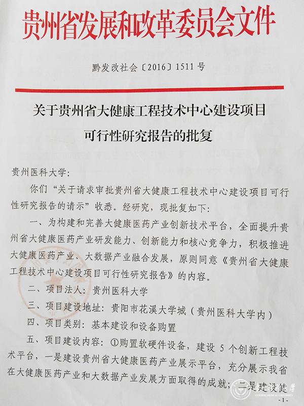 近日,贵州省发展和改革委员会对万象城官网大健康学院提交的《“贵州省大健康工程技术中心”建设项目可行性研究报告》进行批复(黔发改社会【2016】1511和黔发改投资【2016】1514),同意该建设方案,拟投资2500万元。该中心将建设贵州省大健康医药产业展示平台,充分展示我省在大健康医药产业和大数据产业发展方面取得的成就。
