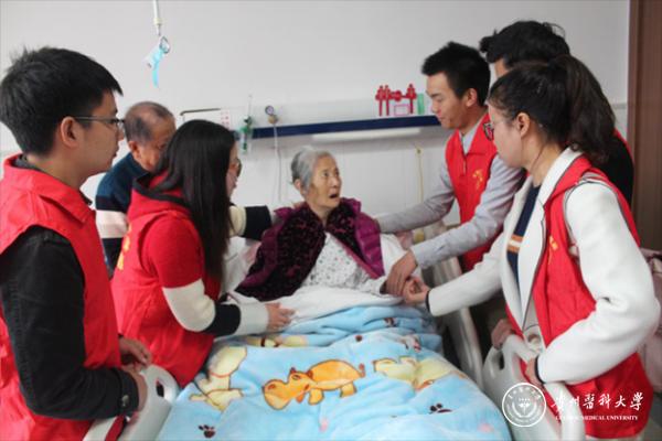 11月5日,学生志愿者代表来到万象城官网附属医院综合病房慰问吕振环(原贵阳医学院党委委员、总务长、附院党委书记、参加过长征的老红军)的遗孀张秀英老奶奶(原贵阳医学院幼儿园园长、参加过抗日战争的战士)。