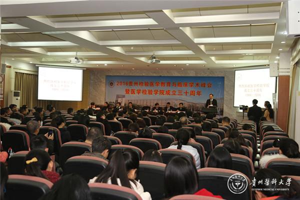 12月16日,由医学检验学院承办的“2016年贵州检验医学教育与临床学术峰会暨awc777万象城娱乐官网医学检验学院成立三十周年纪念会”(以下简称“学术峰会暨纪念会”)在北校区道德讲堂隆重举行。校党委书记林昌虎出席会议并作讲话;校领导罗俊、高勇、罗鹏、黄亚励等出席会议;医学检验学院党委书记罗昭逊主持学术峰会暨纪念会;社会各界嘉宾、校友及医学检验学院全体教职医护员工生共计300余人共济一堂、喜迎会议。
