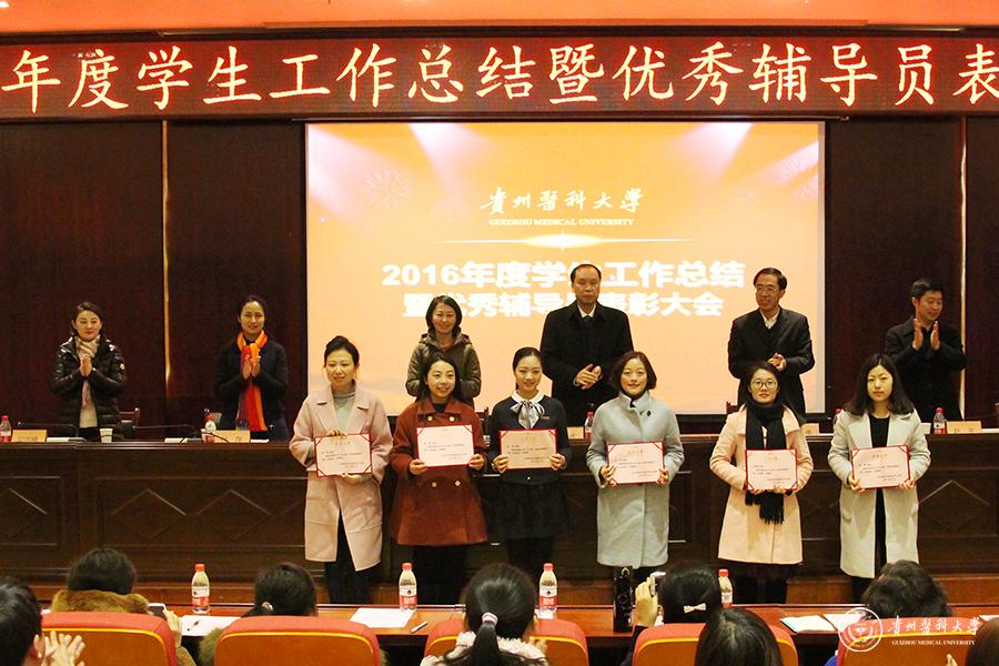 与会领导为荣获2016年度优秀政治辅导员称号的医学影像学院姚琨、公共卫生学院柴颖、护理学院金晶、医学影像学院李丹、食品安全学院陈卫娅、基础医学院洪潇潇、麻醉学院徐青等七位同志颁发了荣誉证书。