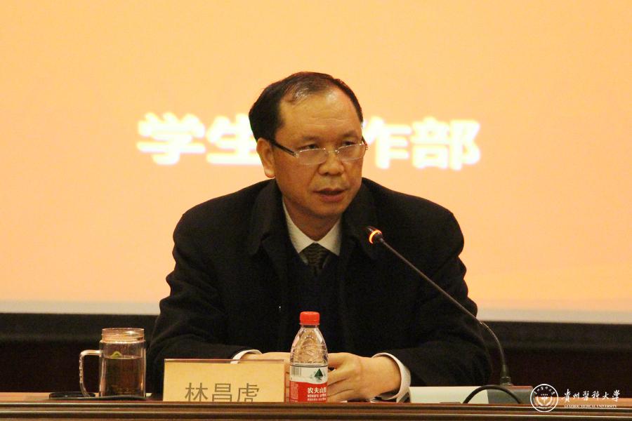 林昌虎在讲话中充分肯定了一年来的团学工作,并代表学校党委、行政对长期以来为学校团学工作、和谐稳定和青年成长付出辛勤劳动的团学工作队伍表示感谢。他指出,2016年是不平凡的一年,学校经历了许多大事件,团学工作队伍带着对学生的感情、对青年的关心、对学校的责任做工作,为学校的平稳运行提供了坚实保障,一些集体和个人也取得了突出的成绩。他对团学工作队伍提出三点希望:一是要正面引导学生形成正能量,做青年学生的引路人;二是要在学习和生活上关心学生,做青年学生的知心人;三是要善于与青年学生交朋友,做学生的贴心人。他勉励团学工作队伍再接再厉,围绕学校2017年内涵发展、环境建设等主题再立新功。