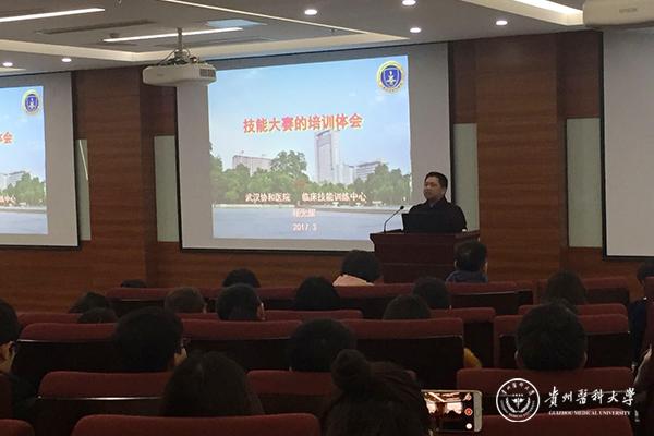 为进一步推动临床实践教学改革、创新实践教学体系,以最好的状态参加第八届全国高等医学院校大学生临床技能竞赛,3月11日,临床医学院邀请华中科技大学医学院附属协和医院临床技能中心主任杨光耀教授在临床技能中心207室举行了全国高等医学院校大学生临床技能竞赛培训会,培训会由临床医学院副院长戚璐主持,临床医学院党委书记周红、副院长艾戎,临床技能中心、生产实习科成员及全体参加培训的教师,2013级、2014级卓越医师教改班学生和此次参加技能竞赛的同学参加了培训会。