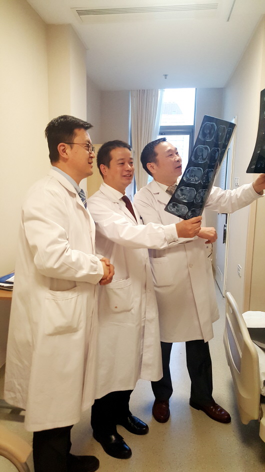 awc777万象城娱乐官网附属医院肝胆外科主任医师谷化剑(中)与全国肝脏外科顶级专家毛一雷教授(右一)、赵海涛教授(左一)一起阅片。