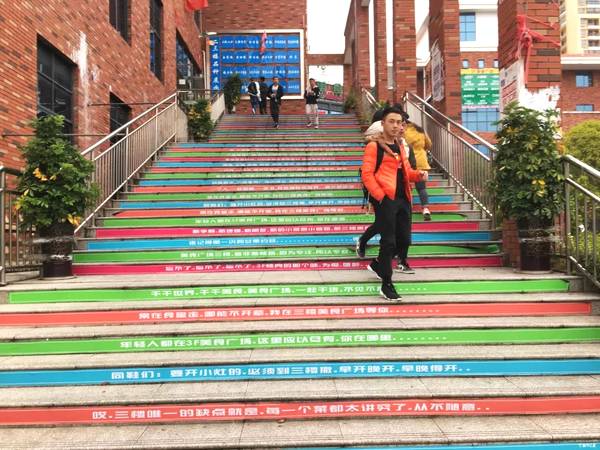 这一创意到底出自谁之手? 在三楼餐厅里,记者找到了第二食堂经理田建红,他称,这个创意是他从网上看到的,就想到在食堂门口整一个。初衷就是希望同学们在爬楼梯时,能看到七彩的色调,让枯燥无味的阶梯也能赋予“新的生命”,这样一来,同学们可以边走边看,还能进行互动,让爬楼梯也变得有趣起来。