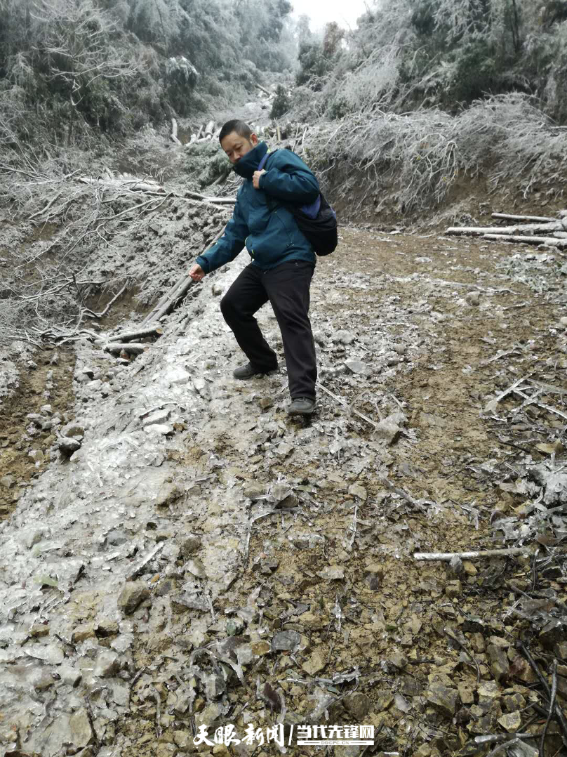 2019年1月凝冻灾情严重,孟立科查看树木倒伏情况,保障入村公路正常通行。