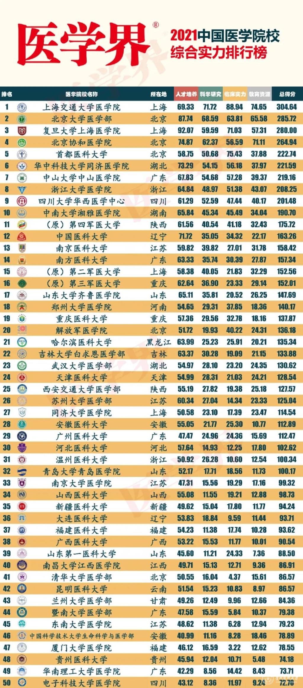 医学界2021中国医学院校综合实力排行榜,是从人才培养、科学研究、临床实力、教育资源四个维度对150多所中国医学院校(不含中医、药科大学与二级学院等)进行衡量,共涉及13个二级指标、49个三级指标。每个维度都采用极大值法进行计算,每个维度总分为100。